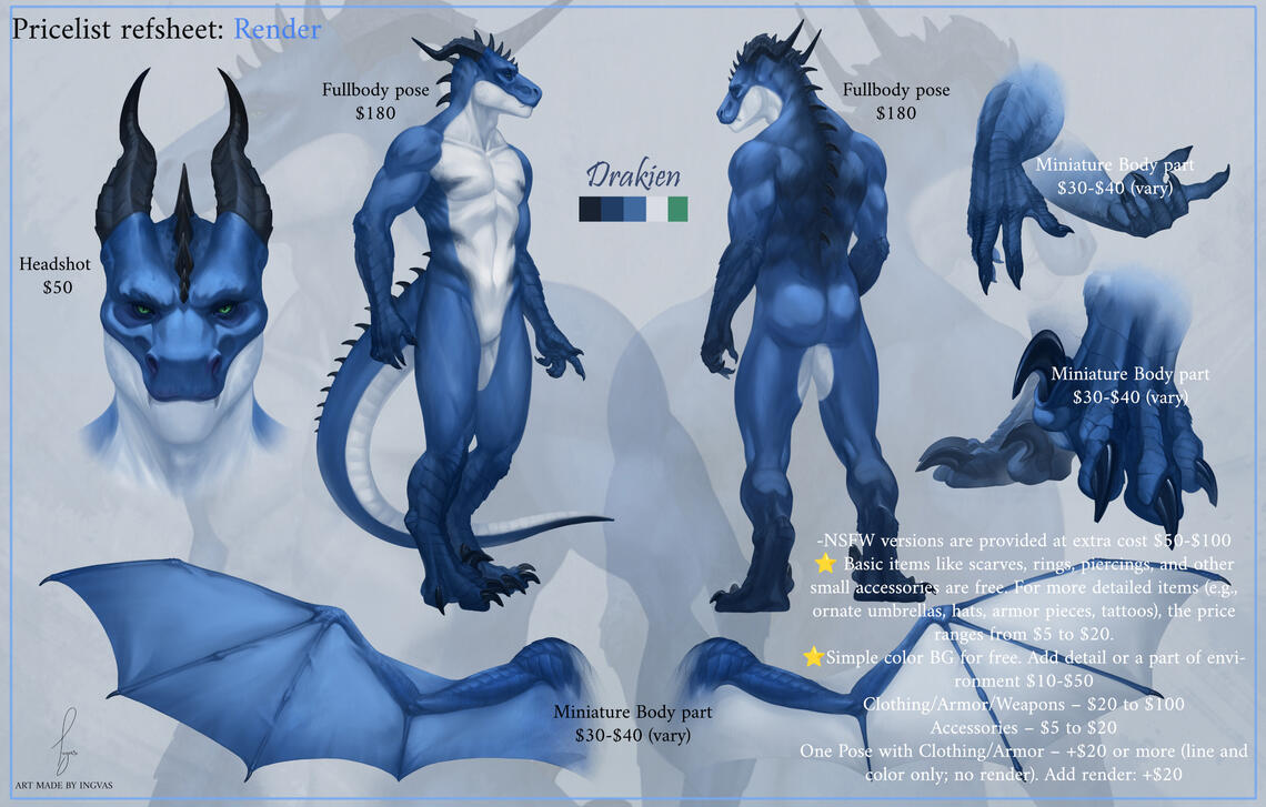 Standard references include line art with flat color, with the option to add rendering for an additional fee.